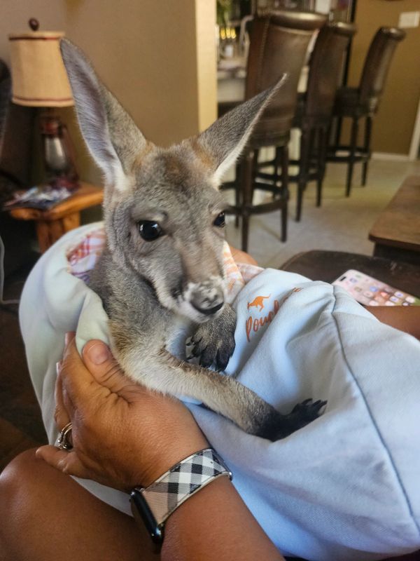 This is "Dottie" our female Red Kangaroo! Dottie was pulled from her mom's pouch on 10/28/25. She weighs in at 10.4 pounds! Red kangaroos are the largest marsupials weighing up to 198 pounds! Originating from Australia. They are great swimmers and are incapable of walking backwards! Dottie is looking forward to meeting you at your next petting zoo!